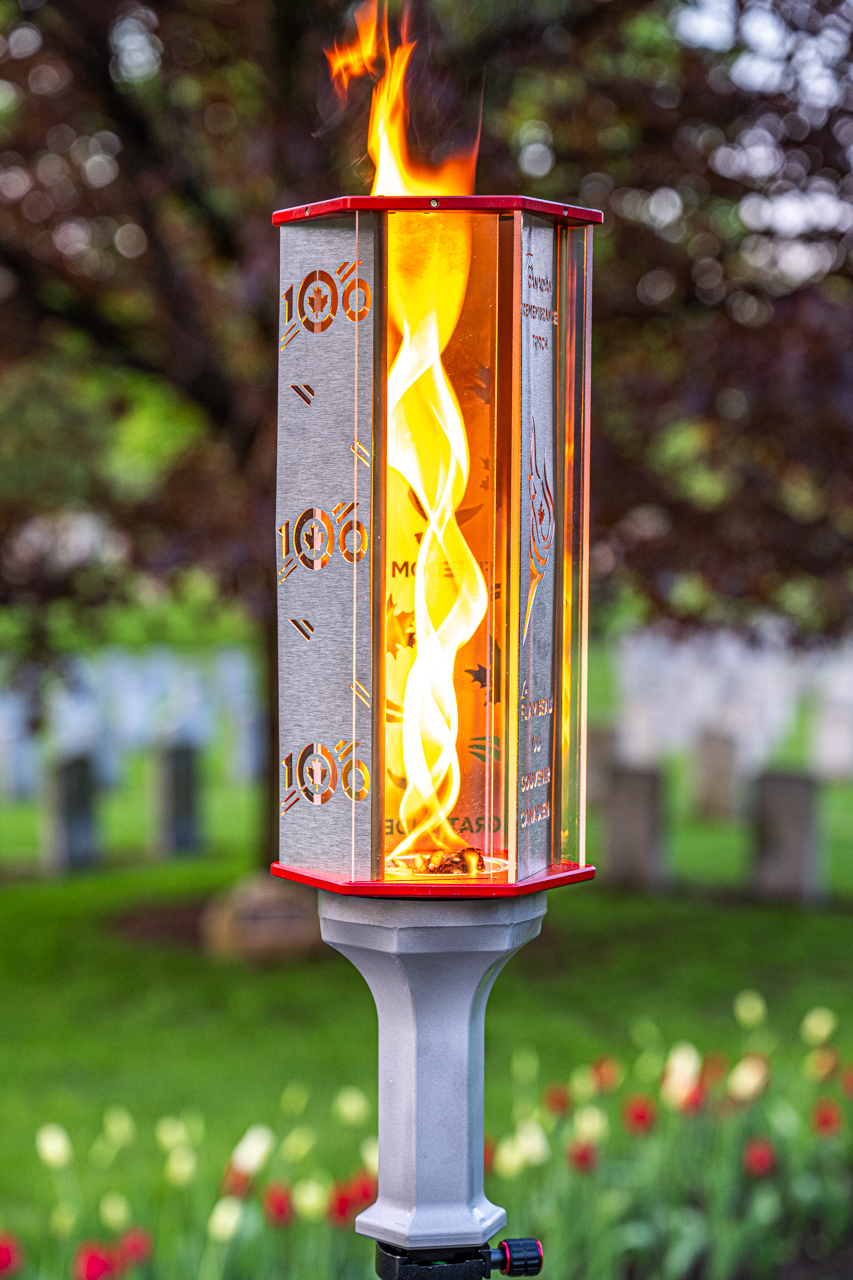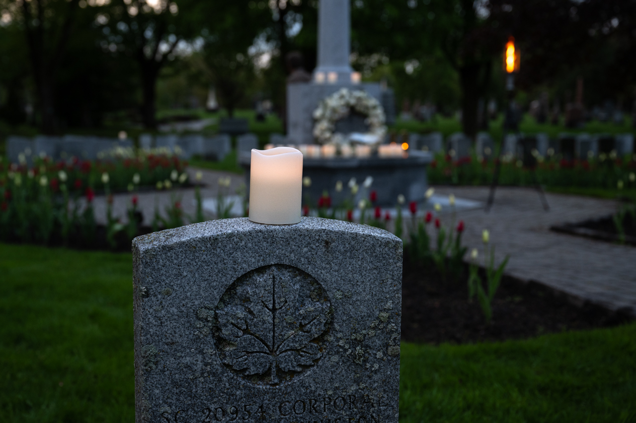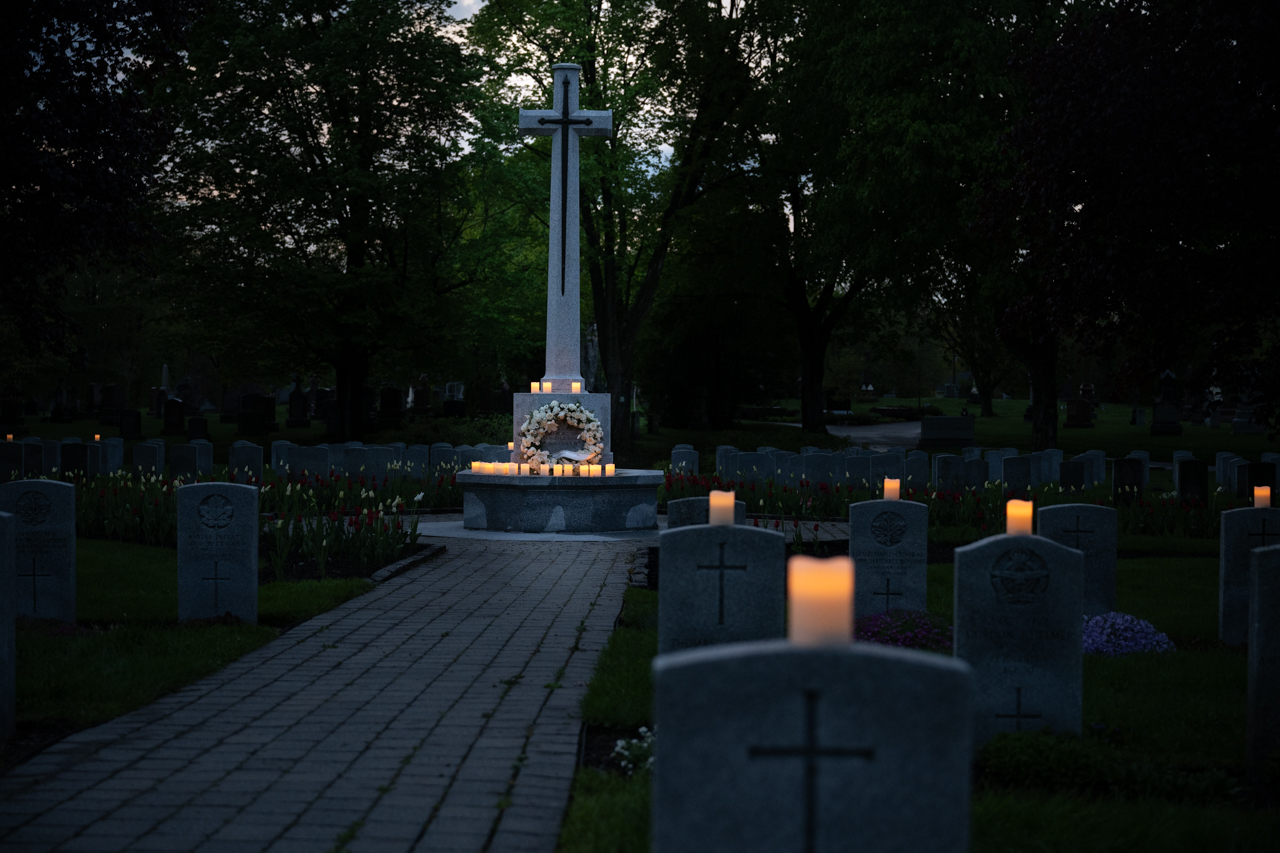 After thanking Mrs. Hunter, Mr. Loken signalled for the lighting of the Canadian Remembrance Torch, a symbolic act followed by the announcement of a candlelight procession led by Cadets. This procession was designed to honour prominent Second World War Veterans and figures within the cemetery. Guests departed the Memorial Cross building and proceeded into Section 27 of Beechwood Cemetery, led by Mr. McCarthy. During the candlelight procession, local cadets and guests were guided through Section 27, where Mr.McCarthy highlighted the prominent Second World War Veterans buried there.