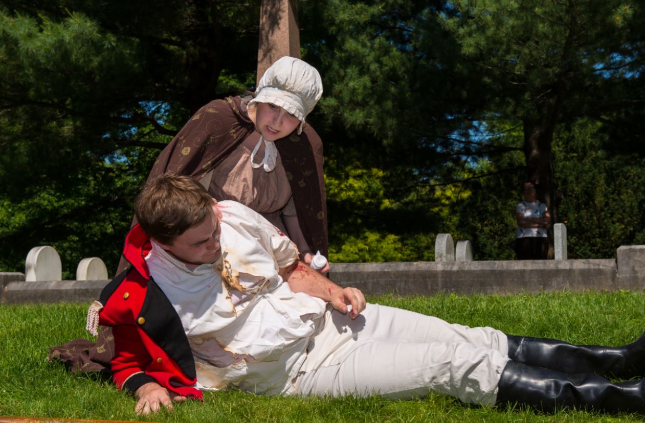 When the U.S. army invaded again in 1813 and occupied the Niagara frontier, British generals ordered women and children to withdraw to Montreal. Legend says Maria disguised herself as a man, donning a redcoat, to follow Sgt. Hill. Her identity was revealed when she was run over by an ammunition wagon and examined by a doctor. She was partially disabled for life. Yet, as a nurse, she was allowed to stay and help the surgeons cope with overwhelming numbers of badly injured soldiers at the 1814 battles of Chippawa and the bloodiest, at Lundy’s Lane. Once the war ended, the Hills took land in the Richmond military settlement and ran the tavern in the town.