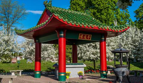 Pour la visite de l'Est, votre guide vous rencontrera à la pagode chinoise, qui est la structure en bois rouge que vous voyez lorsque vous entrez par l'avenue Saint-Laurent (du côté opposé à celui du Centre commémoratif national Beechwood).