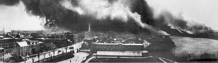 1900 Hull–Ottawa fire - Around 10 AM on April 26, 1900 a defective chimney on a house in Hull caught fire, which quickly spread between the wooden houses due to windy conditions. Within two hours the blaze had destroyed several surrounding blocks. At that point it began to spread along the river, where there were large lumber companies on the banks and islands, and huge amounts of stacked lumber that quickly ignited. By 1 PM the fire jumped the river on embers and set the Ottawa side ablaze.