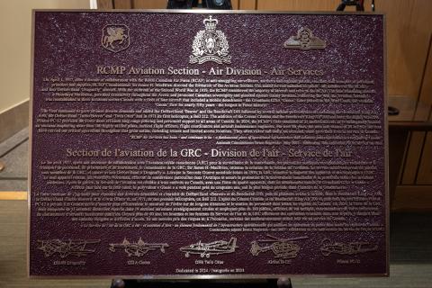 The ceremony featured the unveiling of a commemorative plaque honouring the RCMP Aviation Section's history and achievements. Madame Ginette Petitpas Taylor, Minister of Veterans Affairs Canada; RCMP Commissioner Mike Duheme; RCAF Lieutenant-Colonel Comeau, who also offered congratulations to the Royal Canadian Air Force on its 100th anniversary this year; Mr. Roch Séguin, current Director-General of RCMP Air Services; and Louisa Russo-Lemay, 1st Vice-President of the RCMP Veterans Association – Ottawa Division and former Director-General of RCMP Air Services, participated in this meaningful moment.