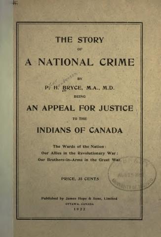 In 1922, Bryce, the former chief medical officer for the Department of the Interior and the Department of Indian Affairs, published and distributed The Story of a National Crime, being an Appeal for Justice to the Indians of Canada, a document so powerful that its words rang out to the hearts and minds of his intended audience — the Canadian public — and still ring out to the descendants of those whose story he wanted to share.