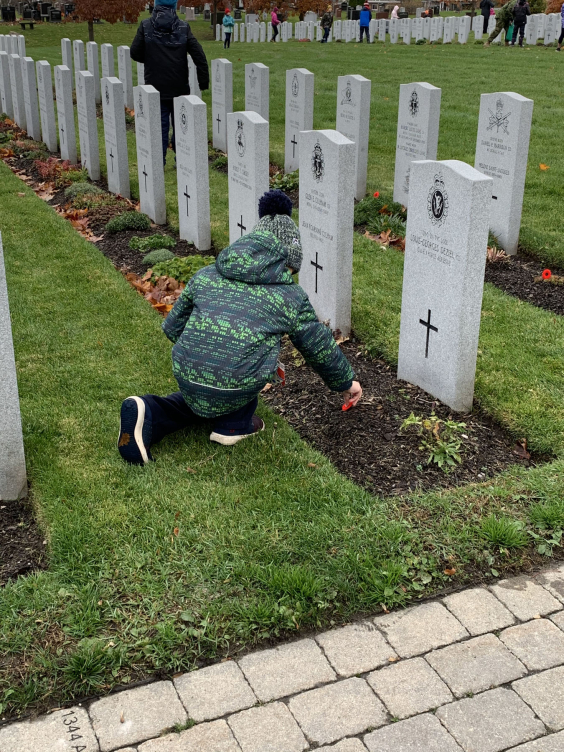 In ones and twos, with envelopes of poppies in hand, the schoolchildren from l’École élémentaire catholique Saint-François-d’Assise in Hintonburg fan out across the grounds of the National Military Cemetery at Beechwood Cemetery. The Grade 5 and 6 students, effusive and chatty on any other day, are silent now as they approach the graves of Canada’s military dead. They have a sombre duty to perform, and are taking their responsibility very seriously.