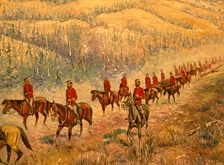 One historical account notes a possible connection to the March West in 1874 and Assistant Commissioner James Macleod. Assistant Commissioner Macleod was said to have been impressed with the great herds of prairie buffalo. So much so, he thought it was a "splendid" idea to have the buffalo head on the buttons of the members' tunics. That suggestion was later adopted. The bison is of historical significance as it provided food and clothing for the March West of the original North West Mounted Police.