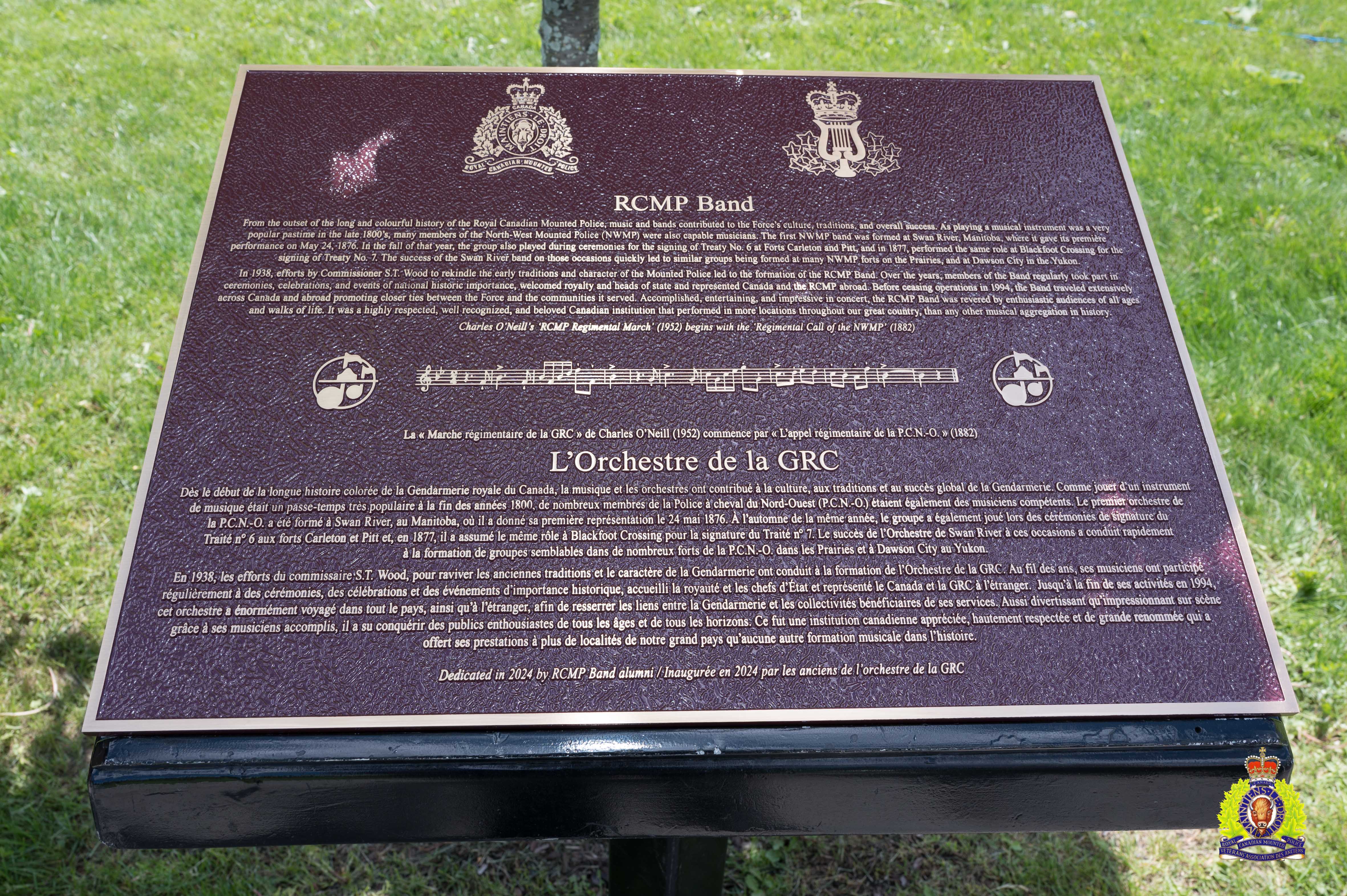In commemorating the RCMP Band, we not only honour its legacy but also celebrate the enduring power of music to unite, inspire, and uplift. May this plaque stand as a tribute to all those who contributed to its storied history and as a beacon of inspiration for generations to come.