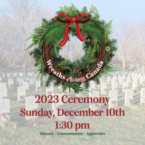 The 2023 Wreaths Across Canada ceremony will be held on Sunday, December 10th 2023 at 1:30 PM in Section 27!
