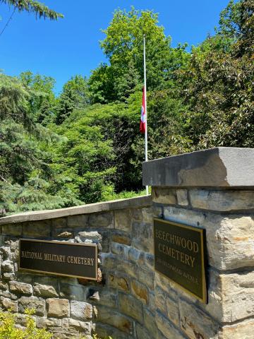 À partir d'aujourd'hui, 31 mai 2021, et jusqu'au 8 juin, les drapeaux de l'entrée principale du cimetière Beechwood seront en berne à la mémoire des 215 enfants dont les restes ont été retrouvés sur le site d'un ancien pensionnat à Kamloops, en Colombie-Britannique.