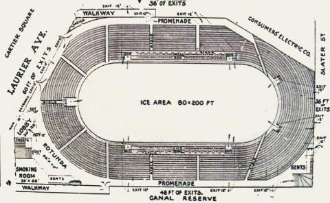 Avec sa moustache bien taillée, son expression sévère et ses demi-guêtres blanches protégeant ses souliers, M. Dey était une figure familière à l’aréna. Les partisans ont été choqués du fait qu’il vend ses intérêts dans l’équipe et déménage à New York. Éventuellement, M. Dey et son épouse s’installent en Colombie-Britannique, et il décède le 15 avril 1943. Photo: Les plan pour l'arena Dey 1907.